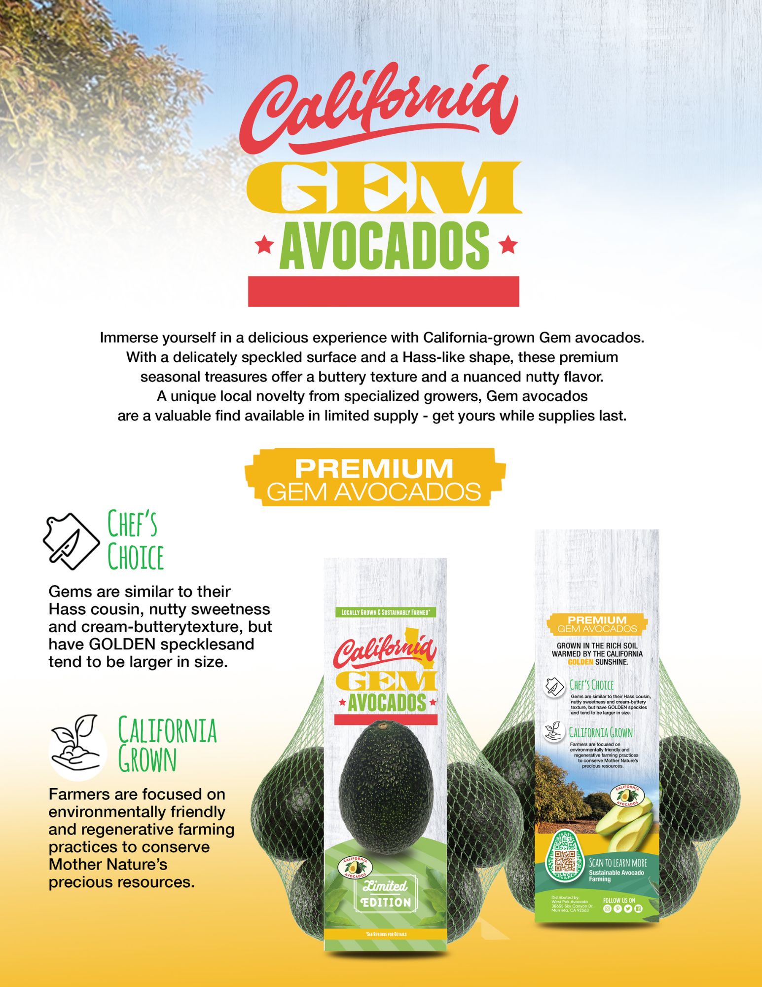 To ensure a year-round supply of premium avocados, West Pak is committed to sourcing excellence by investing in various countries of origin. Our country-of-origin bags feature innovative packaging that identifies the source of avocados by their growing regions —California, Mexico, and Colombia —and offer a glimpse into the rich culture and culinary heritage of each area.